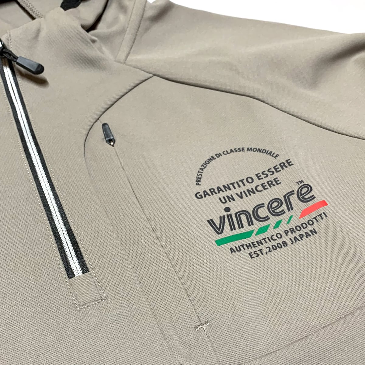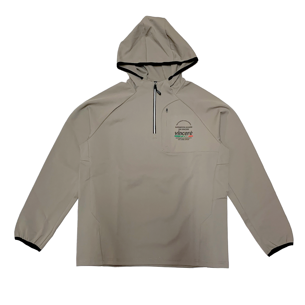 ストレッチの効いた腰のあるジャージ生地を使用したハーフジップパーカー